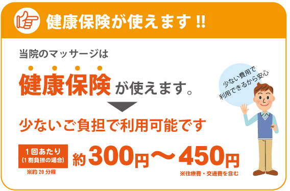 1回20分程度、「あん摩マッサージ指圧師」がお伺いさせていただく往療費・交通費を含めても、自己負担1割の患者様なら、ご利用料金が300〜450円と低料金です。安心してご利用いただけます。 このため、多くのご利用者様は、月に平均8〜12回程度、ご利用下さっております。