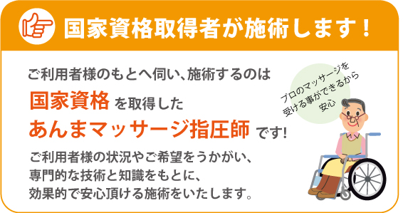 国家資格を持つマッサージ師が医師の同意のもと健康保険証の負担割合の料金でご自宅や施設などご希望の場所にお伺いして、マッサージと機能維持回復訓練を行います。
