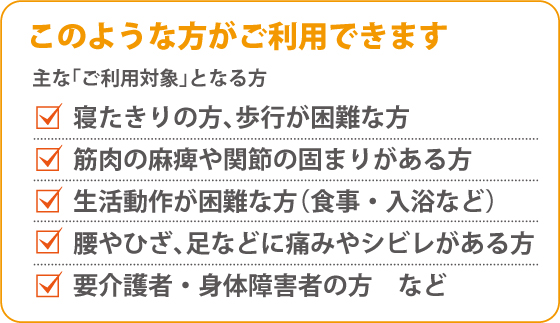 脳卒中(脳塞栓、脳溢血、脳血栓)後遺症・脳内出血後遺症・廃用症候群 ・筋萎縮性側索硬化症(ALS)・脊椎カリエス・坐骨神経痛・変形性脊椎症・大腿骨頸部骨折による後遺症・パーキンソン病、症候群・がん術後(胃がん)・リウマチ、関節リウマチ血行促進、血行改善 ・拘縮、マヒ・通院困難、歩行困難・脊髄損傷後遺症・筋萎縮、筋麻痺・関節拘縮、拘縮予防 など寝たきりの方、歩行が困難な方
