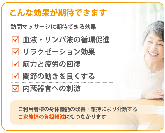 マッサージによる身体への直接的な効果だけでなく、施術者との楽しい会話やあたたかなコミュニケーションが心身をともにリラックスさせ、ご利用者さまの気持ちの安定や笑顔につながります。